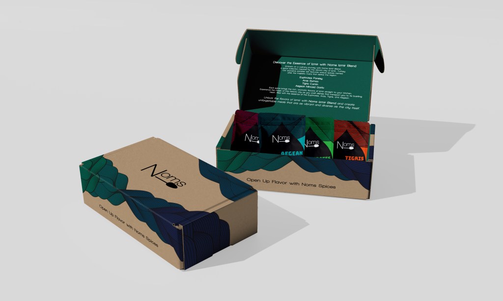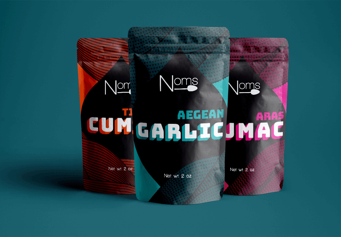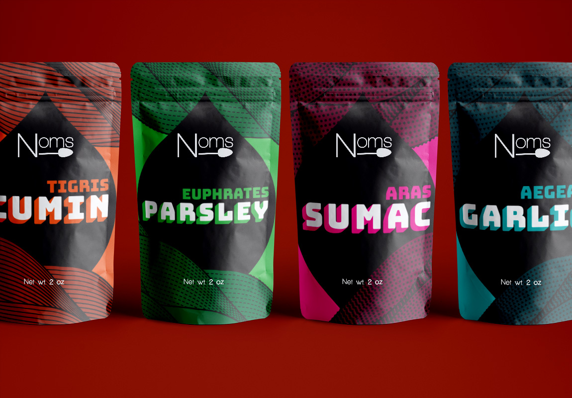 For this project, I designed a pouch and box packaging for a fictional company named Noms, which specializes in spices and dry goods from around the world. Noms, founded in the culturally rich region of Izmir, Turkey, offers spice pouches that can be bought individually or as part of a gift box set. The pouches’ designs are inspired by Turkish rivers, with each blend named accordingly: Aras Sumac, Tigris Cumin, Aegean Minced Garlic, and Euphrates Parsley.